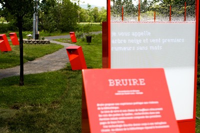 Le Sentier des poètes serpente à travers le bois adjacent à la bibliothèque Étienne-Parent. À son orée, Bruire propose une expérience poétique aux visiteurs de la bibliothèque.