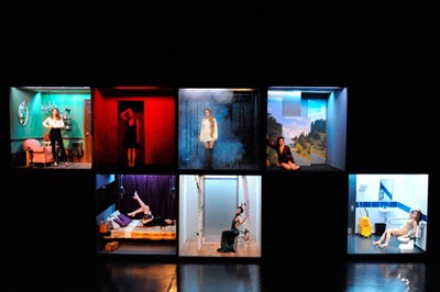 Neuf chambres sont révélées par des fenêtres-vitrines. Derrière six d’entre elles sont exposées des femmes évoluant dans leur espace privé. À chaque chambre correspond un chant. Chaque chant est l’expression d’une obsession, d’une angoisse ou d’un espoir récurrent dans la pensée et dans l’écriture de Nelly. Chaque chant est porté par une femme différente. Le septième chant, le chant perdu, est le chant du Chœur, dirigé par le personnage du spectre qui s’insinue ponctuellement dans l’intimité des femmes. Loin de Nelly et différente d’elle, chacune de ces femmes incarne un aspect des matières abordées dans son écriture.