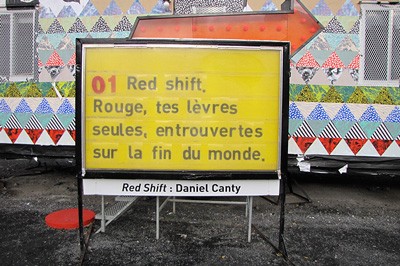 Présenté à Montréal dans le cadre du projet Écritures publiques de Dare-Dare – centre d’artistes, du 9 août au 17 octobre 2012, à proximité de l’édicule du métro Saint-Laurent.
